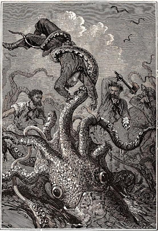 《海底两万里》插图里的巨鱿鱼。图片:Twenty Thousand Leagues Under the Sea