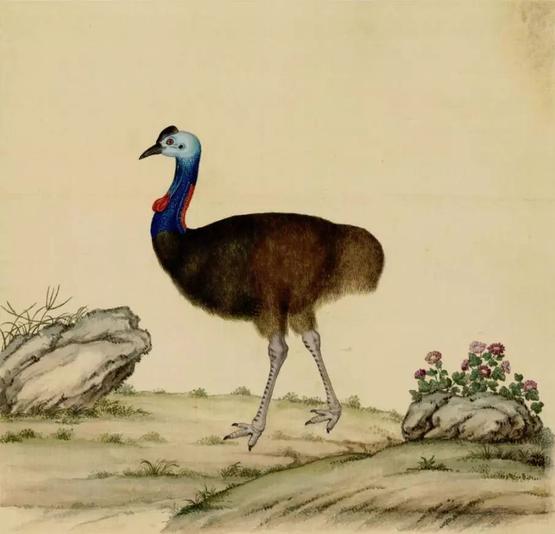 《鸟谱》对鹤鸵的介绍文字,来自乾隆写的短文,而文章内容大部分出自法国解剖学家佩罗(Claude Perrault)研究鹤鸵的科学报告。“额摩鸟”这个名字,来自印尼语系的“emeu”,在乾隆时代,这个词是西方人对不会飞的大型鸟类的总称,今天演变成emu,专指澳大利亚的鸸鹋[ér miáo](Dromaius novaehollandiae)。
