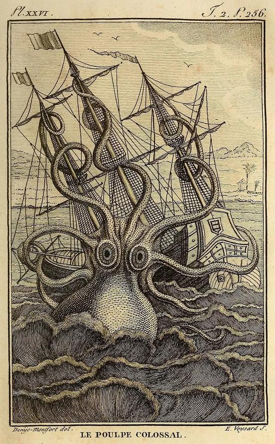 这张画是法国自然学家德蒙福特(Pierre Dénys de Montfort)在1801年画的。画里的克拉肯是只特大的章鱼。这可以说明,当时人们认为克拉肯是头足纲动物,但还不清楚它到底属于头足纲的哪一类。