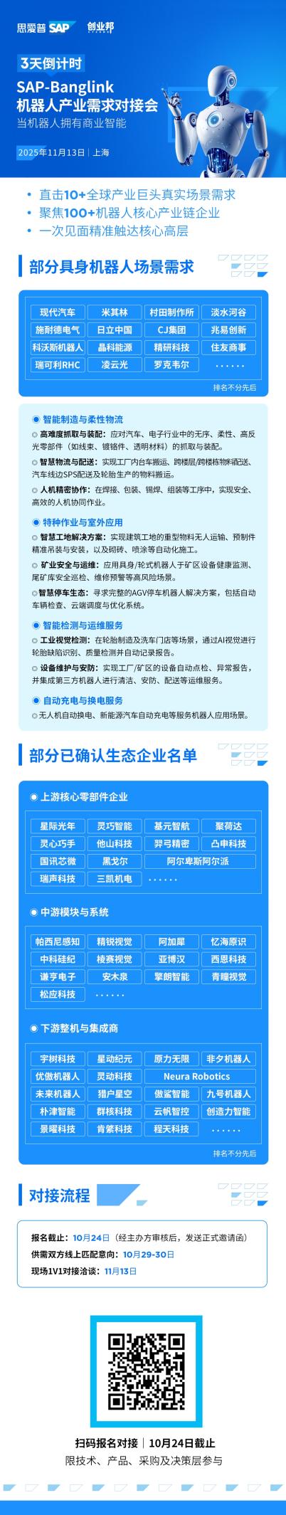 11月13日,SAP联合创业邦在上海发起具身智能机器人产业需求闭门对接会Banglink,聚焦真实场景需求,定向邀请100+产业链核心企业,与全球产业巨头开展1V1精准对接。
