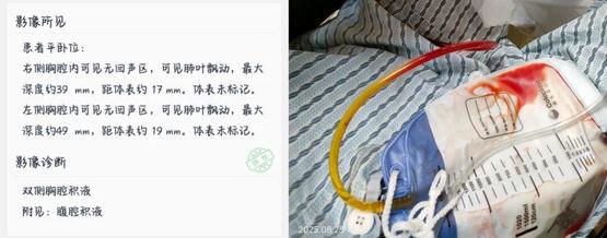 胸腔积液B超检测结果&引流出来的胸腔积液丨作者供图