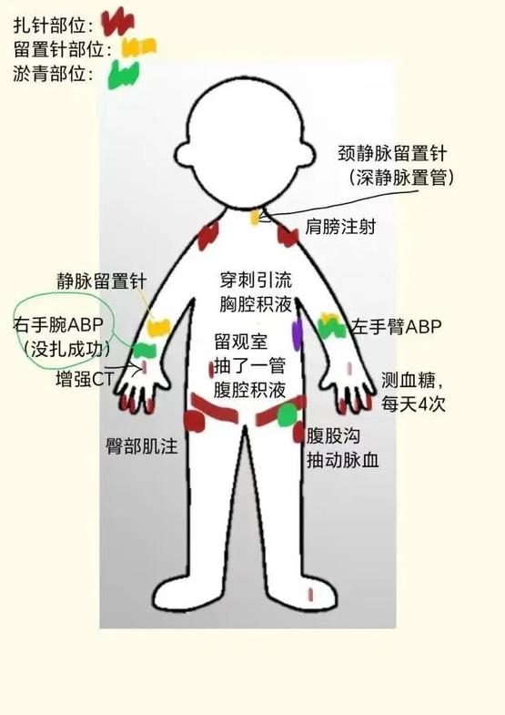 在ICU里,我的身体插满了管子、接满了仪器,头旁边挂着一个塑料袋,因为我有时还会干呕(其实吐不出什么东西了,胃肠减压把我的胃内容物吸得干干净净)。我每天还要测4次末梢血糖,肩膀还要挨2次皮下针,打入预防血栓的药。