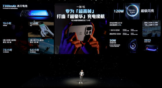 一加 15搭载专为高性能手机打造的 7300mAh 超大「冰川电池」,配合 120W 超级闪充,带来旗舰档位手机中最豪华的充电续航组合。一加 15 所搭载的电池采用新一代仿生硅碳材料与双电芯结构,能量密度高达 814Wh/L,足以支撑全天候续航需求。一加 15 支持行业领先的 120W 有线闪充,同时还配备 50W 无线闪充,为用户带来更加灵活的充电选择。针对游戏场景,一加 15带来行业首发「局间补电」技术,还搭载行业领先的「旁路供电」功能,确保玩家在长时间对战中也能保持满血状态。