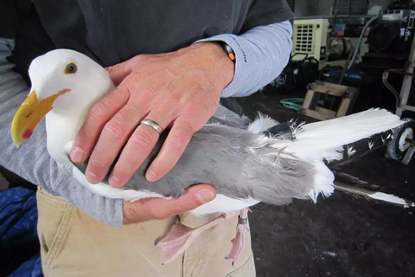 谢弗成功捕获了这只海鸥,小心地把它装进枕头套里带回实验室。他在它尾巴根部安装了一个火柴盒大小的GPS追踪器,还用记号笔在它的额头点了一个点,方便日后识别。