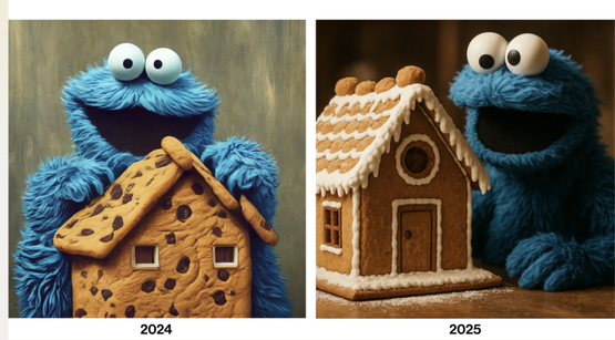 新的模型和工具开始内置更多“理解”维度:语义、构图、风格、版式逻辑。根据missioncloud一篇对比分析,2025年图像生成在真实感、细节掌握、纹理区分上比2024年提升明显,比如下面例子:2024图像还塑料感十足,2025版本的毛发、布料、光影都显得真实可触。