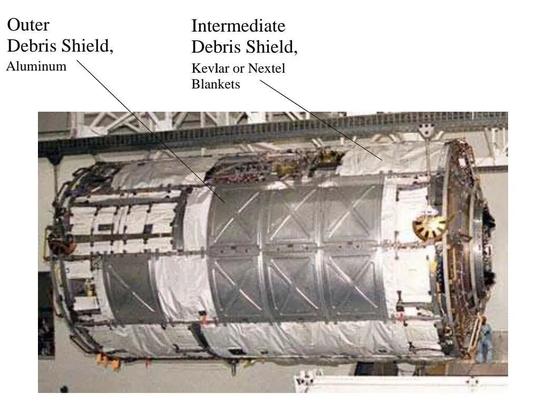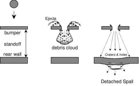 铝硬壳外层先让碎片解体成微粒云;中间空隙让这个高速微粒云扩散、失速;柔韧的凯夫拉内层承受剩余动量,保护舱内结构。