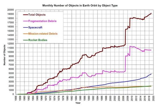 图表里突然跃升的曲线,代表着一些太空垃圾暴增事件,往往是航天器互相碰撞,产生了更多的碎片所致。这些碰撞,有的是无心的意外,有些则是精准的有意为之。