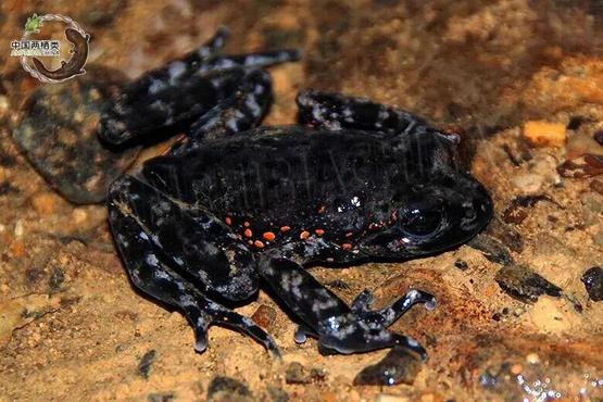 这是我国特有的红点齿蟾,于1979年根据贵州遵义的标本发表。虽然红点齿蟾的蝌蚪体型巨大,但成体只有5-7厘米,成蟾常栖息于有泉水或阴河的山洞内,在离洞口不远处全黑暗的流溪岸边岩石上活动。