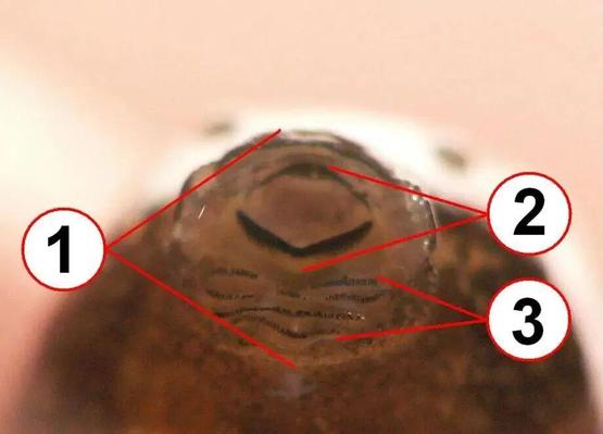 1为口区,2为口腔开口(角质化喙),3为角质化小牙齿丨Wikipedia