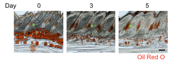 刺激后对脂肪(红色)的染色,发现脂肪从脂肪细胞进入了毛囊中