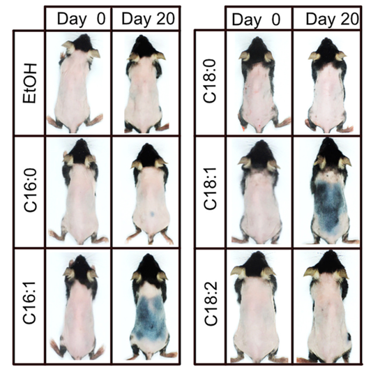 涂抹乙醇和两种不同长度、饱和度不同的脂肪酸,只有单不饱和脂肪酸有生发效果