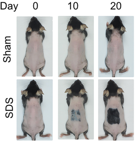 在空白对照(Sham)与 SDS 处理的对比下,SDS 组小鼠的毛发生长明显加速、密度更高,出现了和小红书网友们一样的长毛现象!