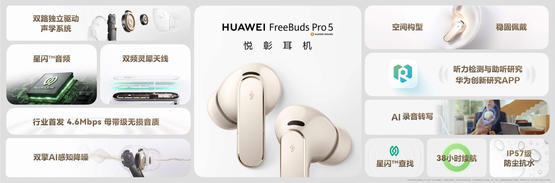 华为FreeBuds Pro 5悦彰耳机采用全新悦彰星环设计,提供四款配色,它是业界首款支持星闪™音频技术的无线耳机,其搭载华为自研第三代音频芯片,配合L2HC 5.0协议,最高传输速率可达4.6Mbps,可聆听96kHz/24bit母带级无损音源。耳机同时是全球首款双擎AI感知降噪耳机,采用业界首个双单元双路主动降噪架构,降噪效果最高提升至220%。华为FreeBuds Pro 5用户在“华为创新研究APP”加入听力检测与助听研究后,耳机可居家进行听力检测并为中轻度听损用户提供听力补偿。同时,FreeBudsPro5新增AI录音转写功能,支持实时转写并生成摘要、待办事项。