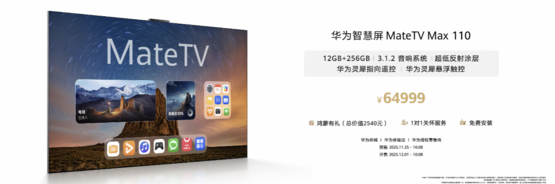 2025年11月25日,华为重磅推出旗舰新品华为智慧屏 MateTV MAX,以110英寸超大尺寸解锁沉浸观感,售价64999元。新品搭载旗舰手机级芯片,实现应用秒开、手游畅玩的超流畅体验;华为灵犀悬浮触控板、华为灵犀指向遥控 2等创新交互外设,打破传统电视操作边界;独立画质芯片“鸿鹄Vivid”搭配华为黑钻屏,全维升级奢华视听;更以家庭“智慧中枢”定位,通过 AI 识人提供千人千面的个性化服务。这款集颠覆性交互、强悍性能、奢华视听与智慧体验于一身的旗舰新品,强势领跑高端电视赛道。