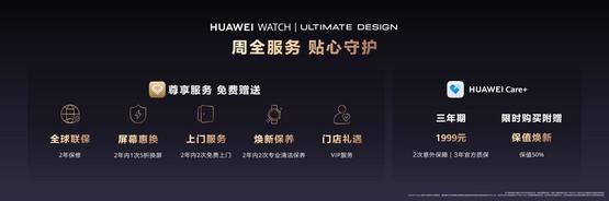 购买HUAWEI WATCH ULTIMATE DESIGN非凡大师紫金款即可获得五大尊享服务 ,其中包含购机享全球联保,2年维保、到店即享门店VIP礼遇 、2年2次免上门服务费、2年1次5折换屏和2年2次免费焕新保养服务,搭配购买HUAWEI Care+综合保障服务产品,为您提供3年2次意外保障及3年官方质保,多重守护,加倍安心;并且还限时(2026年6月30日之前)赠送保值焕新权益。权益生效之日起两年内若原设备满足保值焕新回收标准,即可享受原设备在购买时的官方建议零售价的50%折抵优惠,购买HUAWEI WATCH ULTIMATE DESIGN非凡大师同系列新机(不含本机,不含Ultimate非凡探索系列)。