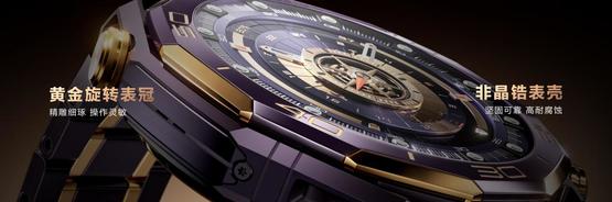 全新HUAWEI WATCH ULTIMATE DESIGN非凡大师紫金款以极致材质与非凡工艺树立高端智能手表设计新标杆。表圈采用业界首创的复合稀土紫色陶瓷配方,经过1400℃高温煅烧成紫,纯手工镶嵌6段18K黄金金条,紫金相彰诠释高贵非凡格调。表壳采用独特镂空设计的全新非晶锆合金材质,历经精密铣削与多重打磨,成就坚固抗蚀、质感卓绝的非凡基底。