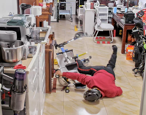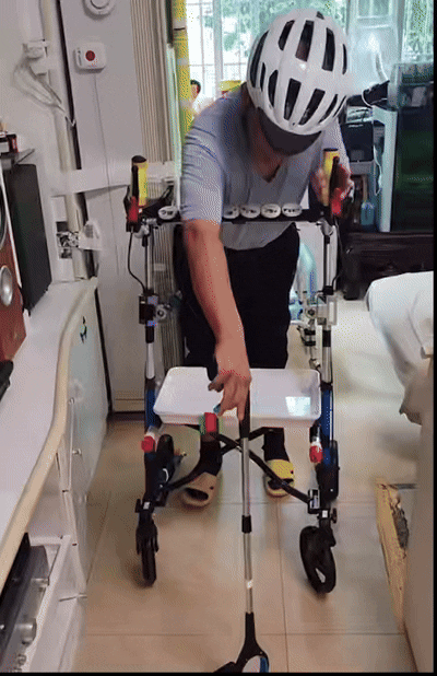 儿子小伍记得,自己一次次地在凌晨带着父亲去医院缝针,最糟糕的一次发生在伍叔刚要从拐杖过渡到助行器的阶段。作为老理工男,他自己用铝型材DIY了一个拐杖,下面装了滑轮。在平面推行很顺滑,但只能提供垂直支撑。
