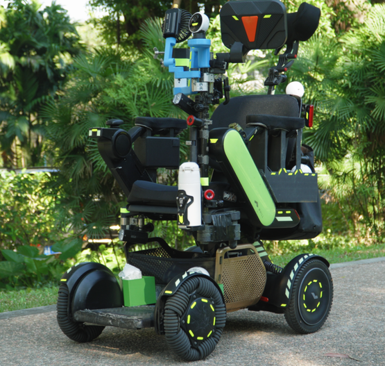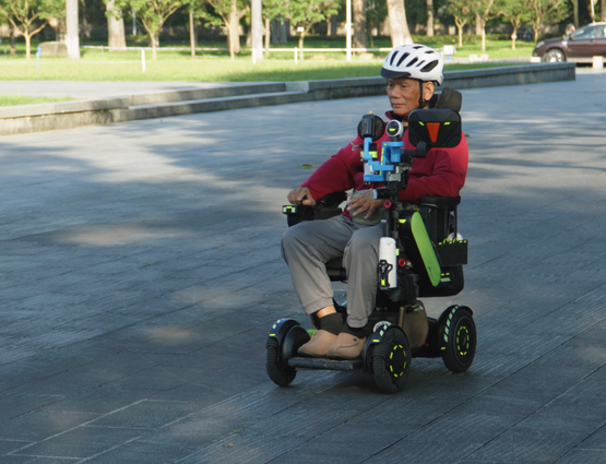 现在的伍叔,出门像开着一辆“重型坦克”。他戴着头盔,轮椅上挂着风扇、水杯。他在树荫下看视频,听音乐,还装了高亮车灯和倒车镜。他可以独自在户外舒适地待上几个小时,不怕日晒雨淋,没有口渴蚊叮,回来还会跟儿子说,“今天又有人跟我说,我这个轮椅好酷!”
