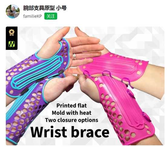 MakerWorld社区之前支持过这样一个模型:那是一位两个女儿的母亲,为了患有肌无力的小女儿设计的腕部支具。在那个模型的主页下,评论区涌入了许多有着相似困境的家庭。更重要的是,因为模型是开源的,每个人都可以根据自己的尺寸缩放,甚至可以换上喜欢的配色和图案。那不再是一个带着病痛标签的冰冷矫形器,它变成了一个有着草莓图案或者酷炫配色的、有温度的礼物。