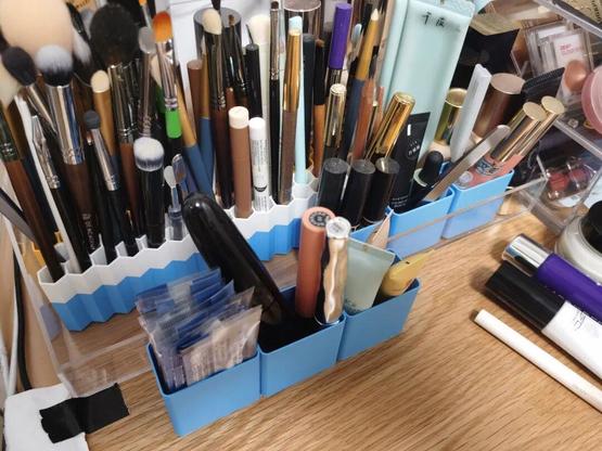 小伍的夫人是化妆师,几十根眉笔、上百把刷子,塞在行李箱的夹层里。每次打开箱子,找一支笔像是在寻宝。伍叔用PLA材料打印了一套模块化的化妆箱。目标很明确:在桌面上占地面积最小,但能把几百样工具全部铺开。摊开时,所有的眉笔和刷子像士兵一样罗列,每一支都有专属的孔洞。小伍形容说:“你想要哪一支,手伸过去,就是哪一支。”