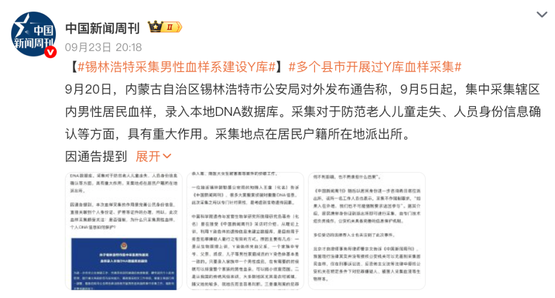 锡林浩特采集男性血样系建设Y库|微博@中国新闻周刊