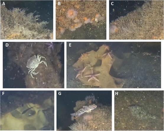 水下潜航器拍摄到的画面:A为某种钟螅水母,B为须毛细指海葵,C为凿贝才女虫,D为普通滨蟹,E普通海星,F为大西洋鳕鱼,E为黑虾虎鱼,H为欧洲川鲽|参考文献[1]