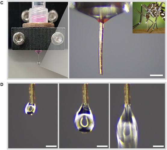(C)雌性蚊子的口器被安装在定制的3D DIW打印机上;(D)口器针头挤出Cellink Start凝胶(一种3D打印生物墨水)丨参考资料1