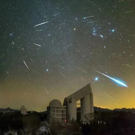 又逢年底双子雨双子座流星雨,从每年12月7日活跃到17日前后,极大期则出现在每年的12月14日前后。极大时理论上每小时可以出现超过100颗流星,近年来更是经常超过150颗。这些流星看起来都像是从双子座头部射出,因而得名双子座流星雨。下图就是2015年我在国家天文台兴隆观测站拍摄的,可以看到无数流星都像是从同一位置射出。