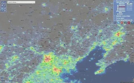 到底哪里才能避开光害呢?你可以参考光害地图。比如下面北京周边光害图所示,图上越暗的地方,光害就越小,观星和看流星雨的效果也越好。此外,记得要找一片开阔地,周围不要有太多遮挡。根据经验,多数流星会出现在靠近地平线的低空附近。