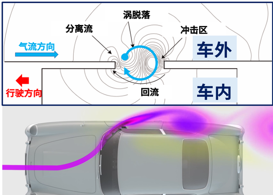 开单个窗口时,窗口外侧的快速气流与车内几乎静止的空气间,会形成一层很薄的“夹层风”。可以把它想象成一张被来风拉紧的薄幕。窗口上的这张薄幕会起伏、波动、卷成小涡。它还会贴着门框和玻璃滑行,刚进来不远就回卷成局部小环路,很快又被带回窗外。