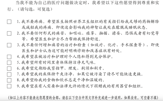 同时,还特别列出三种具体情况——生命末期、不可逆转的昏迷状态、持续植物状态,让填写人进一步选择到那时是否使用生命支持治疗。