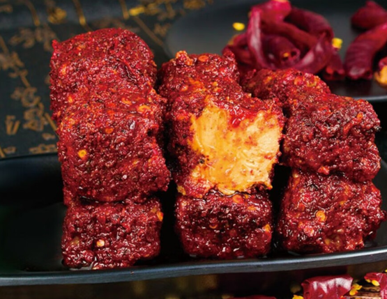 云南的腐乳和川渝腐乳一脉相承,同样靠辣椒让它变得火红。在云南,腐乳叫“卤腐”,分为酒卤腐和油卤腐,油卤腐是将裹着辣椒的腐乳浸在菜油里做成的,油润光亮,后来还有了用鸡枞油做的plus版,味道就更香了。