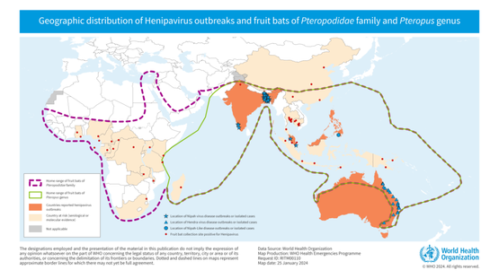 亨尼帕病毒暴发与果蝠分布的全球空间叠加图|世界卫生组织