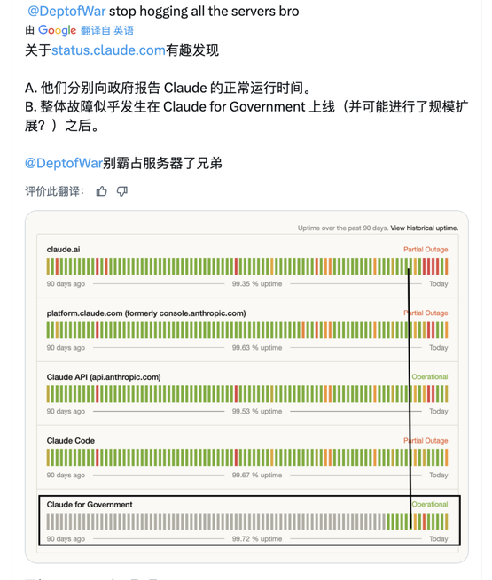 Claude for Government: Operational(运行正常)一位眼尖的网友在推特上截下了这一幕,并配上了一句令人哑然失笑的吐槽:@DeptofWar stop hogging all the servers bro.(美国战争部,别霸占服务器了兄弟。)
