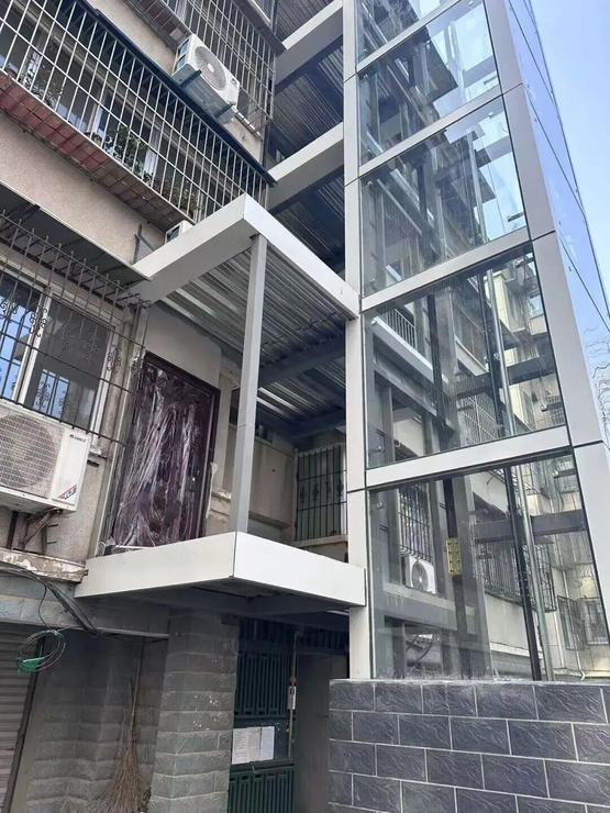 去年12月,电梯开始施工。如今,电梯的井道框架已经搭建完毕,二楼到六楼已经建好入户平台,井道和房屋之间的连廊也都搭建完成。只有一楼两户和电梯之间隔着一道空隙。