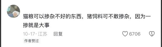 而且由于是肩负国民吃肉重任的猪饲料,还有相对严格的安全标准。(这也导致宠物圈早就冒出一批“邪修”,专门买猪饲料喂猫喂狗。)