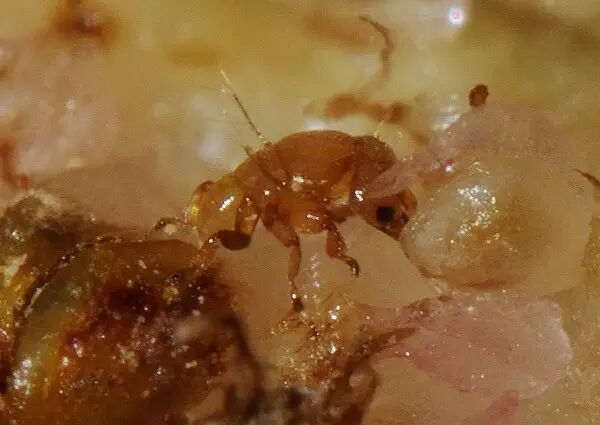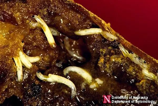 实蝇不会满足于和我们抢柑桔,它们也侵害杨梅、桃、李、枣子、芒果……以及大部分甜甜的水果。而在杨梅中出没的虫子除了实蝇,还有一种果蝇——杨梅黑尾果蝇,在杨梅果子上最常见到的“小白虫”就是它的幼虫。当然,爱吃杨梅的昆虫可多了去。如果一条相貌很重口、有亮棕色头壳的大号白虫子从你的杨梅中款款爬出,那你很可能见到了叶甲的幼虫。
