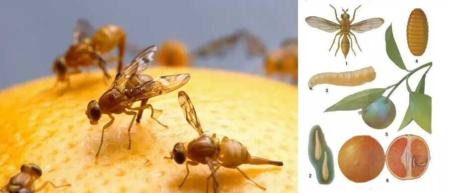 橘子里没教养的小白虫是实蝇的幼虫。实蝇属于双翅目的实蝇科,雌实蝇把卵安置在果实表面,孵化之后,蠕虫钻入果实之内大吃果肉。如果你吃果野山楂或野李子,会发现半数以上的野果里面都会住着几条白而软的实蝇。山野里的食客才不在意这些虫子,对摘果子的猴子和鸟儿来说,虫子反而提供了一点附加的肉食。但是,实蝇足够把怕虫子的女生吓得原地一蹦,扔下果子逃掉,而且果子中的实蝇宝宝如果太多,会把果子蛀得惨不忍睹。小到果农,大到检疫部门,都无时无刻不在提防实蝇的侵入。这也就是新鲜水果不允许带出国境的原因,没人欢迎异国害虫。