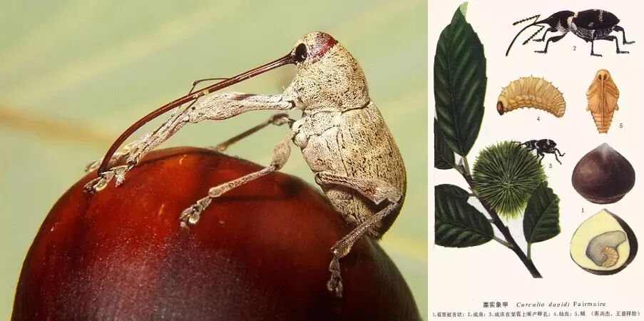 左:象甲产卵前在探测。右:栗实象甲与板栗的那些事儿。图:animalworld.com.ua & blog.bandao.cn