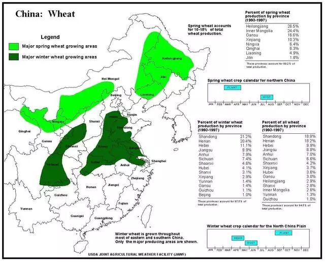 中国小麦主要产区,深绿色是冬小麦,淡绿色是春小麦。