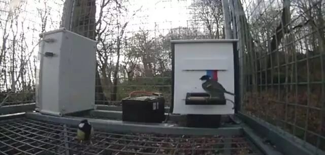 实验中,研究者训练大山雀开门从迷宫盒中取食。图片来源:ox.ac.uk