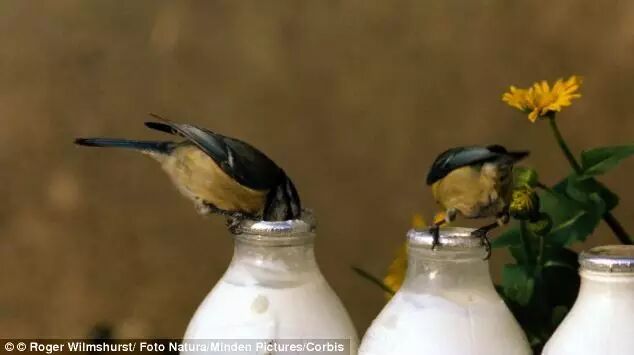 (IvyP/译)在20世纪早期,送奶工会把玻璃瓶装牛奶送到英国人家门口,瓶口用锡箔盖密封。20世纪20年代时,人们开始注意到锡箔上出现了小洞,它们来自淘气的蓝山雀(Cyanistes caeruleus)。这些鸟儿们学会了用嘴啄开锡箔盖,喝掉牛奶表面那层奶皮。这种行为传播得很快,到了20世纪50年代,似乎英国所有的蓝山雀都学会了这个技能。