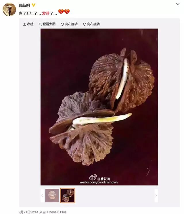 发芽了的文玩核桃。图片:新浪微博截图