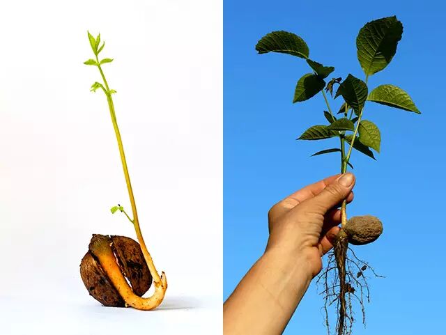 发芽的核桃与核桃幼苗。图片:shutterstock.com