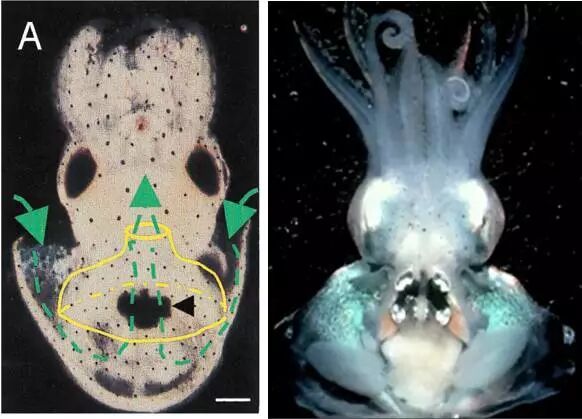 左图中箭头的方向标识的是夏威夷乌贼每次吞吐哈氏弧菌的线路。右图是是夏威夷乌贼的腹侧图片,可以看见左右对称的两侧发光器官。图片:Visick et al. / Journal of Bacteriology(2000);Bonnie Bassler / TED.com