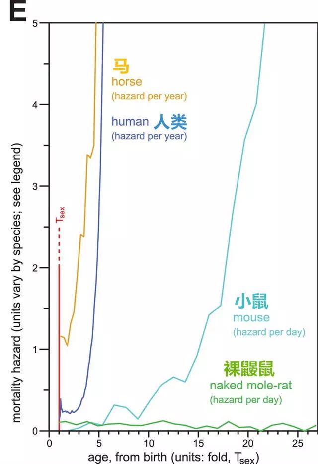 四种动物,马、人、小鼠、裸鼹鼠的死亡率随时间的变化。红色竖线Tsex代表性成熟时间,横坐标的单位长度表示一倍性成熟时间,纵坐标表示死亡率,注意不同物种的单位不同。图片:J Graham Ruby, et al. / eLife(2018)