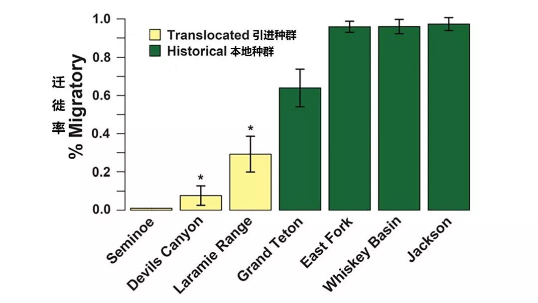 杰斯莫和考夫曼的团队研究了7个种群,结果如图:新引进的动物种群的迁移倾向低于在当地至少繁衍了200多年的本地种群。图片:Brett R. Jesmer et al. / Science (2018)
