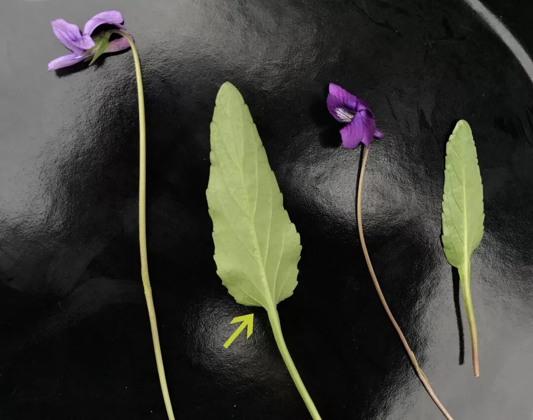 早开堇菜(左)和紫花地丁(右),箭头所指为叶基部。图片:阿蒙