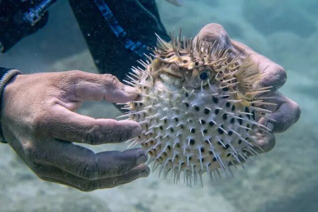 它们在千万年的演化权衡中,抛弃了鱼类的标志性特征,牺牲了闪电般的游速和流线型的身形,装备了坚硬的板甲、厚厚的表皮、可膨胀的身体、凶险无比的毒素以及令人生畏的棘刺,以群体卖萌的姿态,享受着蓝色碧波中“奢侈的慢生活”。这就是球刺鲀。