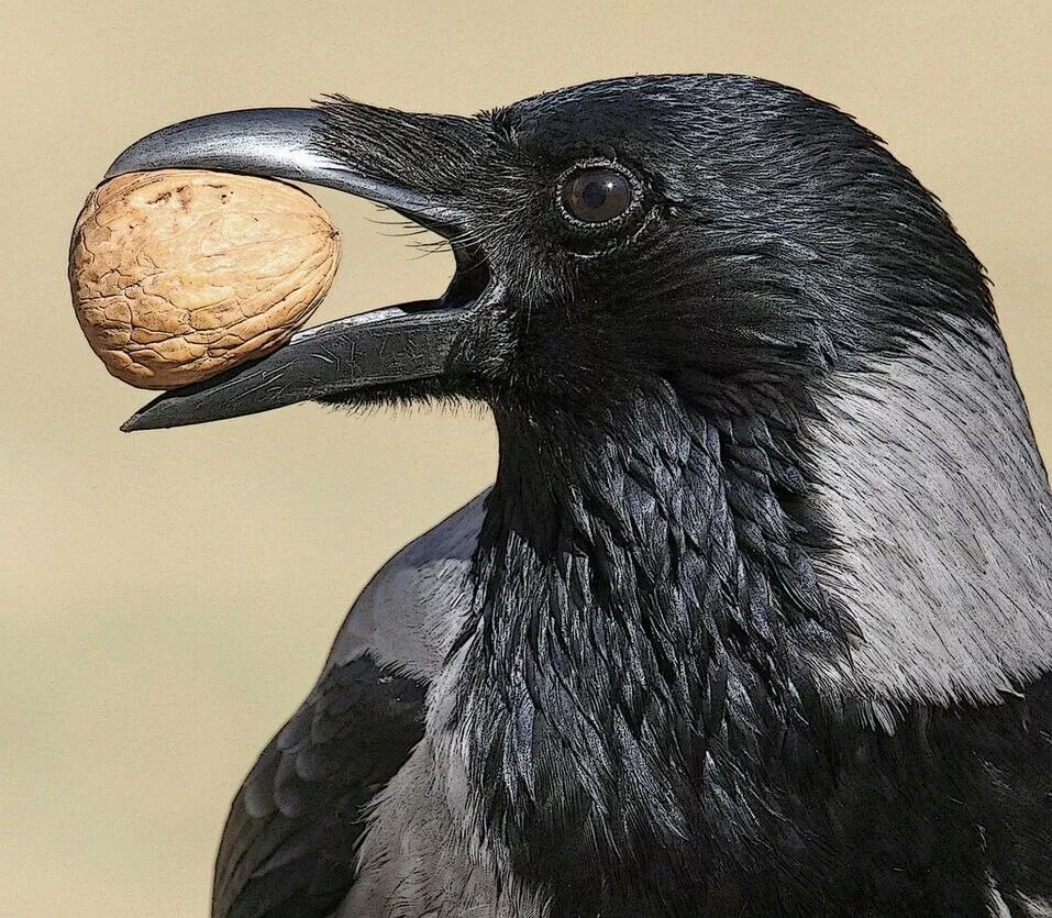 根据衔着胡桃的冠小嘴乌鸦,可以试想一下渡鸦的脑容量。图片:Mixed Media
